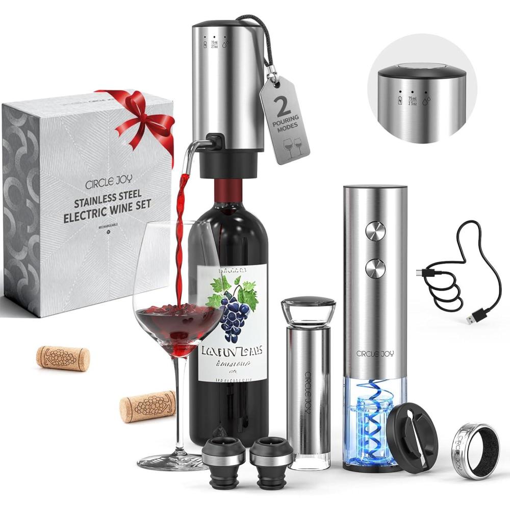 CIRCLE JOY Electric Wine Opener Rechargeable 5-in-1 Stainless Steel Wine Bottle Opener Premium Gift Set with Foil Cutter, Wine Aerator Pourer, Wine Drip Ring & Vacuum Stopper for Wine Lovers(Rechargeable – Silver)