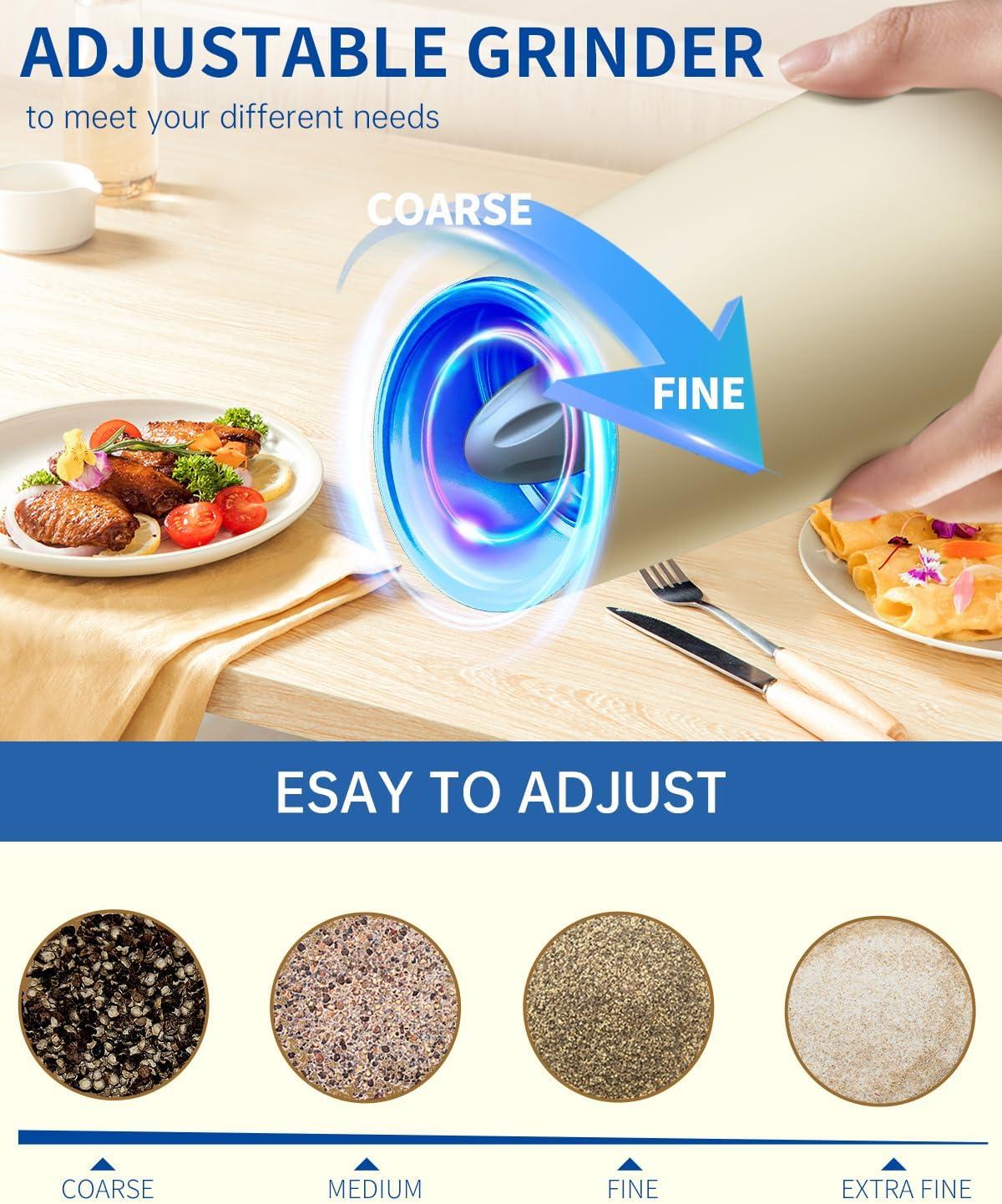【Adjustable Coarseness】This electric pepper grinder set can meet your grinding needs. Easily adjust the core to achieve the perfect coarseness for grinding salt, pepper, or any other seasoning of your choice. The electric salt grinder refillable is made of a high-quality ceramic grinding core to help you retain the original flavor of the spices