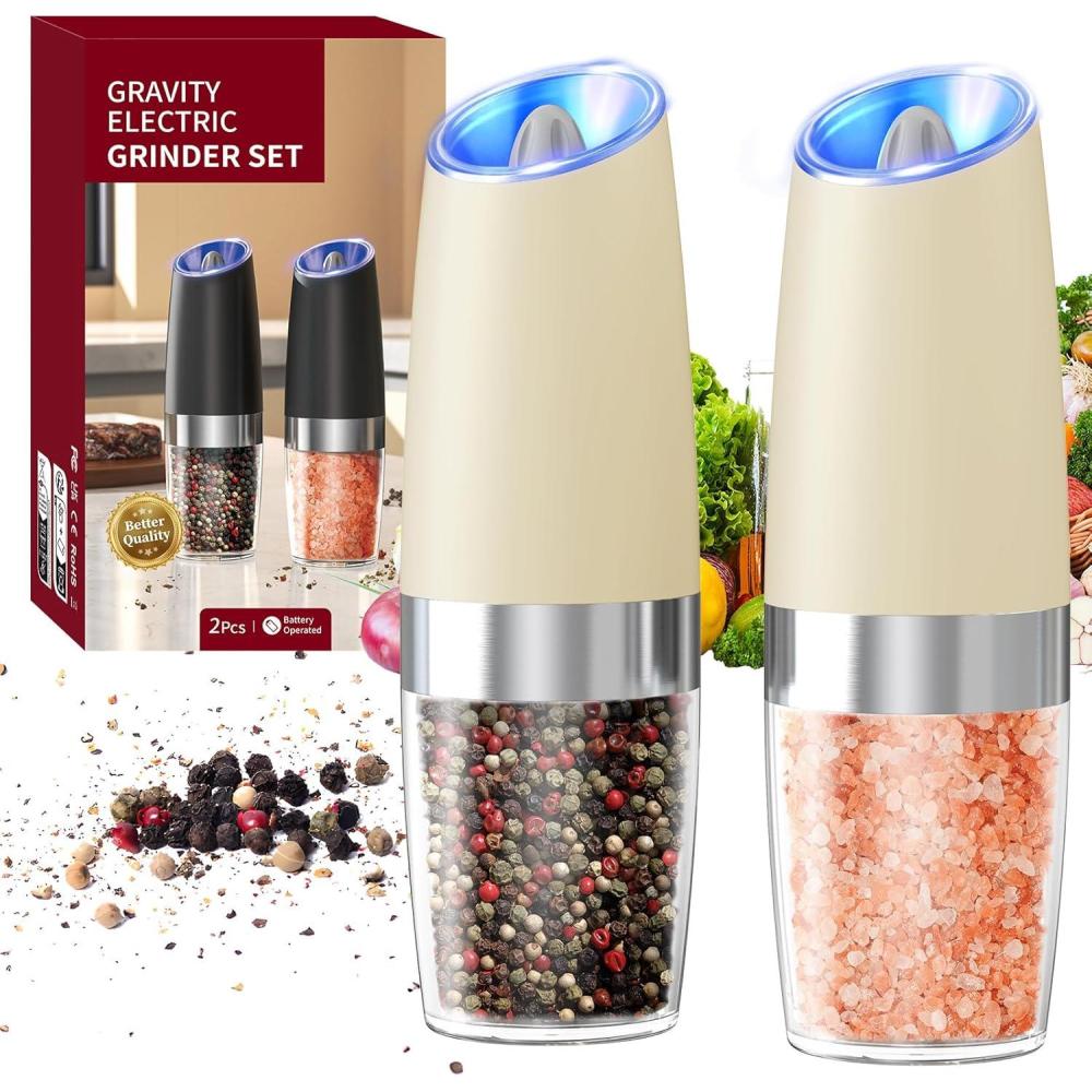 imageCIRCLE JOY Rechargeable Gravity Electric Salt and Pepper Grinder Set Stainless Steels Salt and Pepper Mills with LED Light No Battery Needed Adjustable Coarseness Washable 135ml Container SilverBatteryBeige